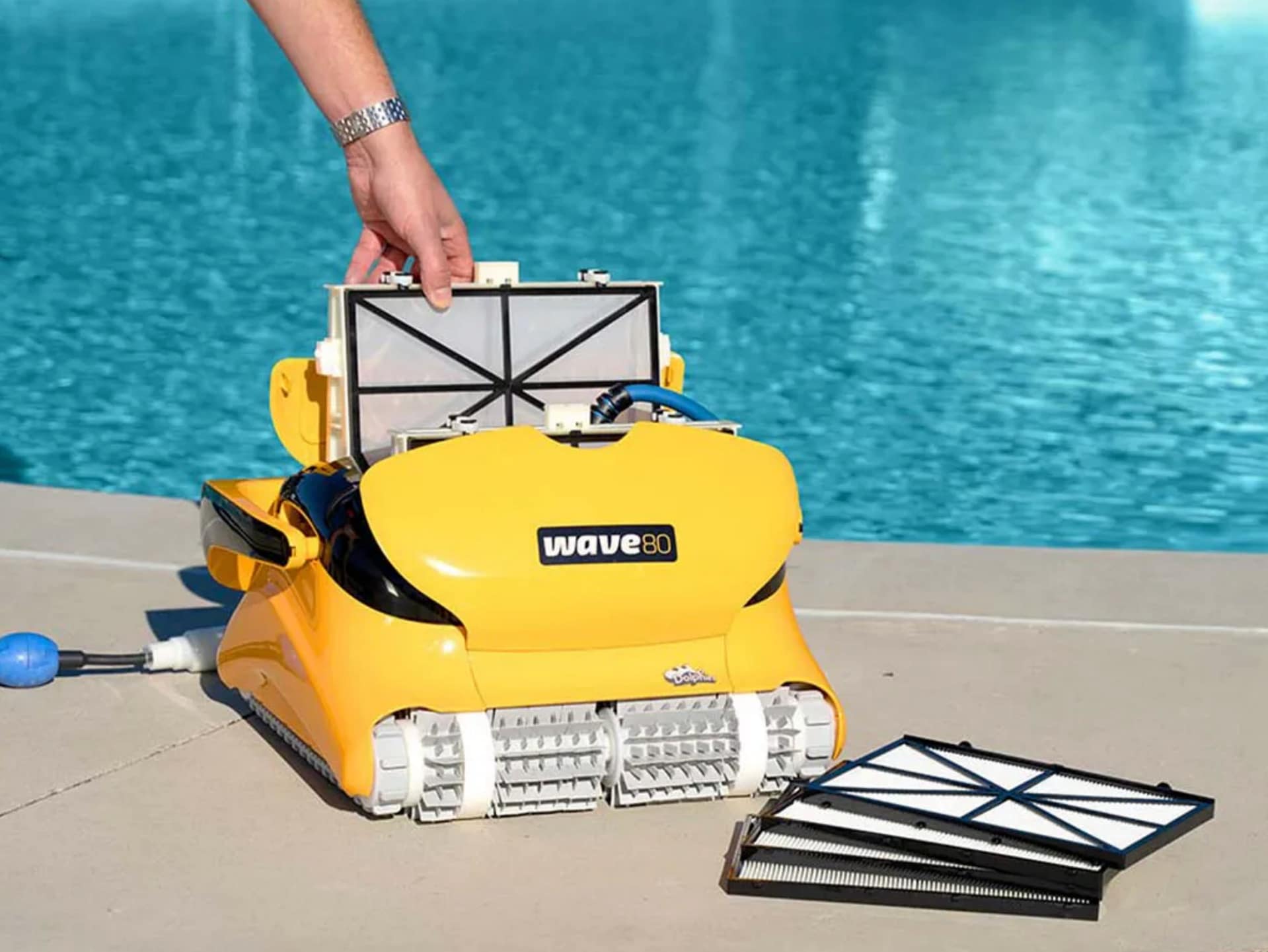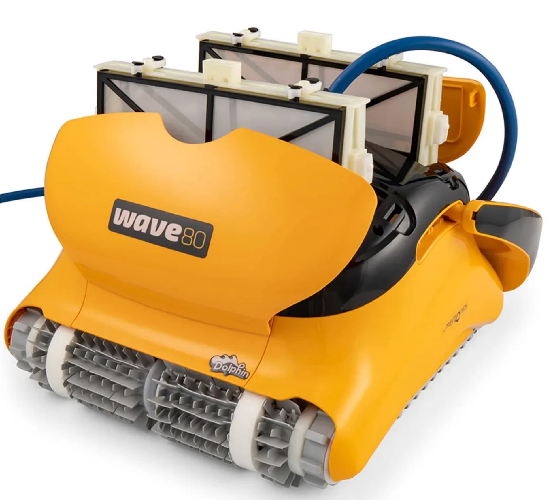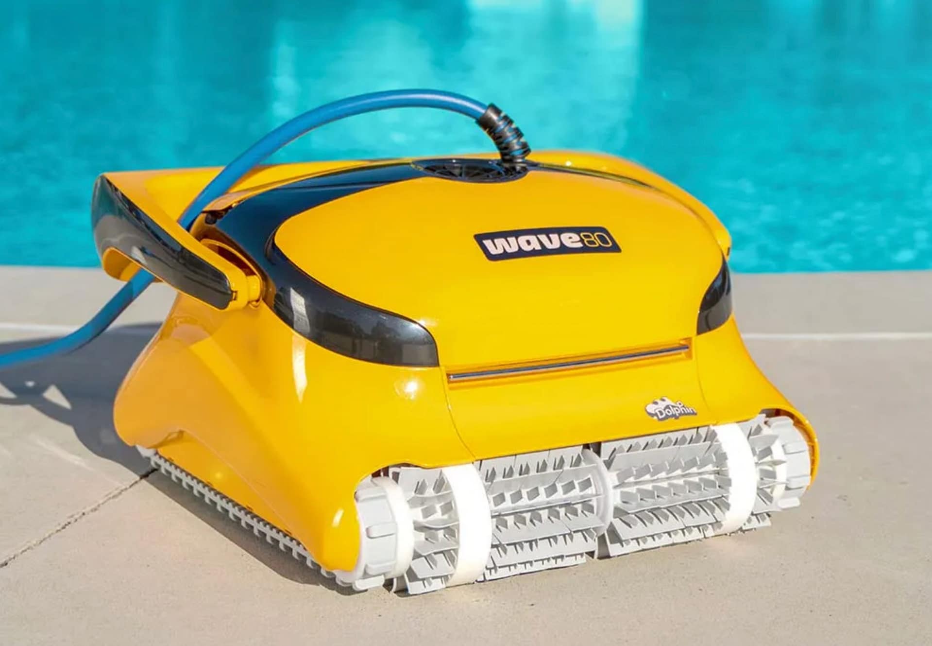 Dolphin WAVE 80 zwembadrobot, speciaal voor het reinigen van middelgrote en grote privé- en commerciële zwembaden tot 20 meter; reinigt de bodem, wanden en waterleiding.