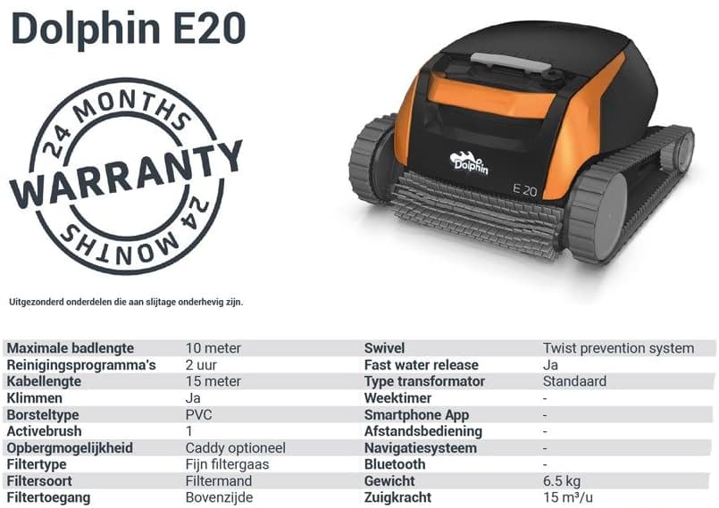 - De Dolphin E20 kan moeiteloos zwembaden tot 10 meter lang aan. Dankzij de baanbrekende technologie en het krachtige ontwerp is dit de perfecte partner voor het onderhoud van uw zwembad.