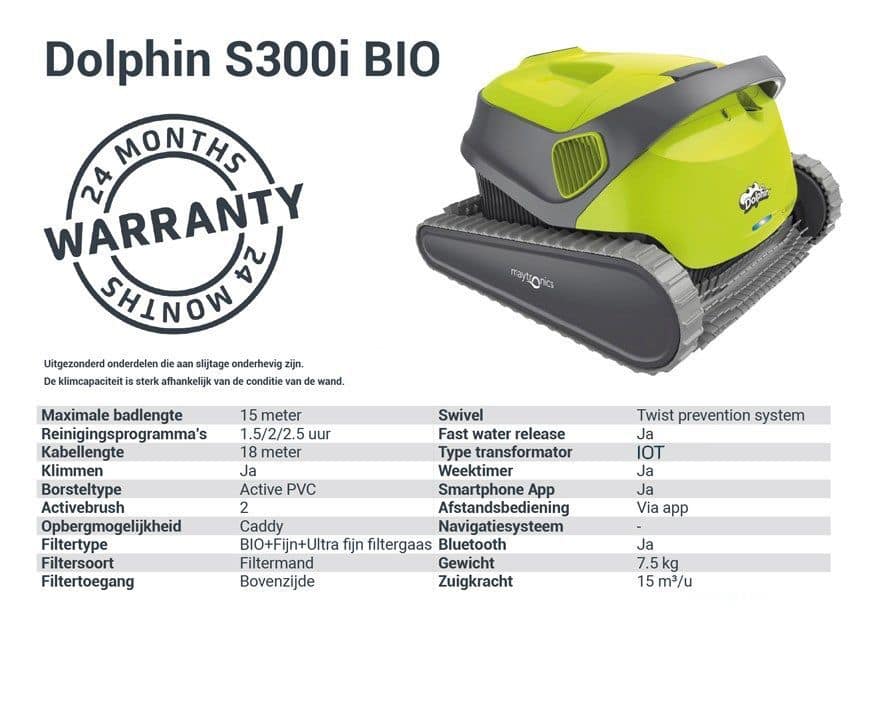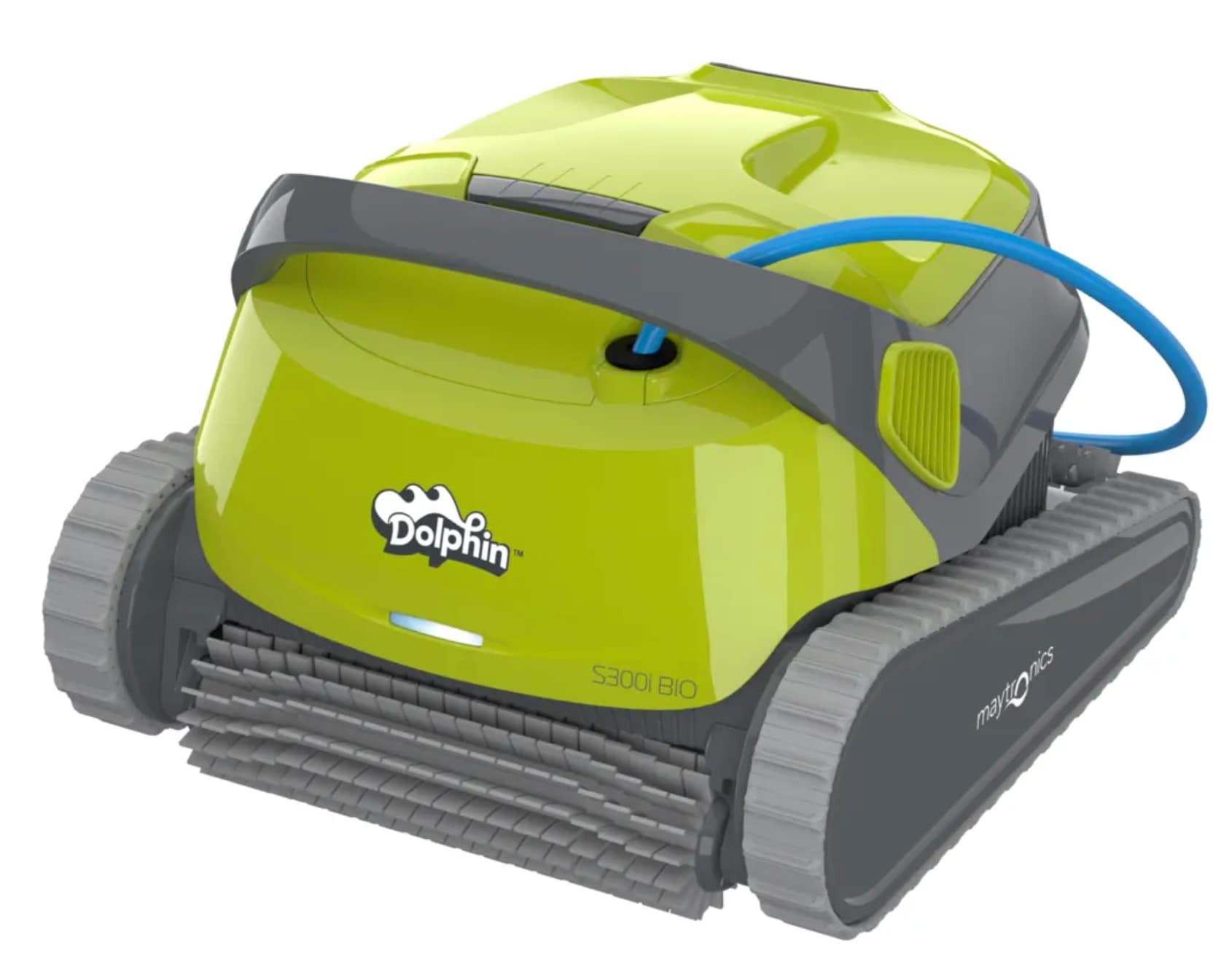- De Dolphin zwembadrobot S300i BIO staat bekend om zijn uitstekende schoonmaak resultaten bij zwembaden en bij zwemvijvers. De robot is in te stellen met verschillende programma’s en verschillende looptijden via de smartphone app. Omdat de S300i BIO twee borstels met “Active Brush” technologie bevat wordt een nog intensievere schoonmaakbeurt uitgevoerd. Tevens is de Dolphin zwembadrobot voorzien van een swivel, meerlaags filter en wordt deze geleverd met een transport caddy.