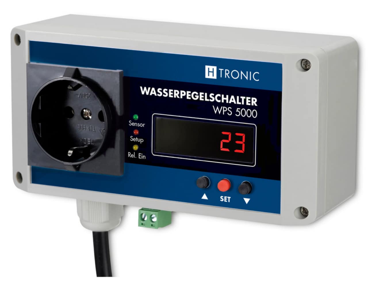 Waterniveauschakelaar WPS 5000 beschikt over sensoren die tot op 30 m afstand kunnen worden geplaatst. Hierdoor kan de waterniveauschakelaar vrij worden geprogrammeerd tussen verschillende schakelpunten (niveaus). Wanneer er water binnendringt of wanneer het vooraf ingestelde waterniveau is bereikt, reageert het relais van de WPS 5000 (optioneel met digitale vertragingsinstelling) en schakelt een aangesloten 230 V-verbruiker via het ingebouwde stopcontact.