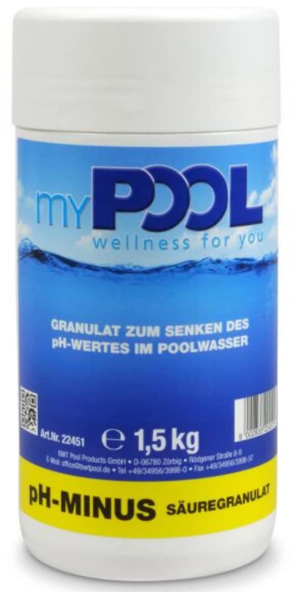 Het pH-Minus Poeder van myPOOL is een snel oplosbaar, zuur poeder dat speciaal is ontwikkeld voor het verlagen van de pH-waarde in zwembadwater. De eerste en belangrijkste stap bij de waterbehandeling van uw zwembad is het correct instellen van de pH-waarde. pH-Minus van myPOOL verlaagt de pH-waarde van zwembadwater van het alkalische naar het neutrale bereik.