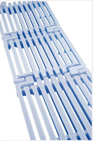 Gootroosterplaat in de lengterichting naar het zwembad. Gemaakt van polypropyleen. Leveringsomvang is 5 stuks = 1.024 strekkende meter. De flexibiliteit van de verbindingen maakt een lichte bocht met een straal van 5 m mogelijk.