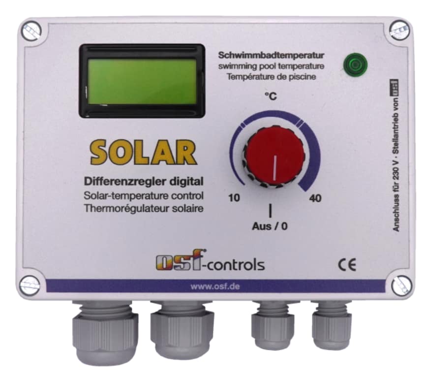 Deze elektronische temperatuurregeling op basis van zonne-energie is speciaal ontworpen voor gebruik in zwembaden die worden verwarmd door middel van zonneabsorbers.